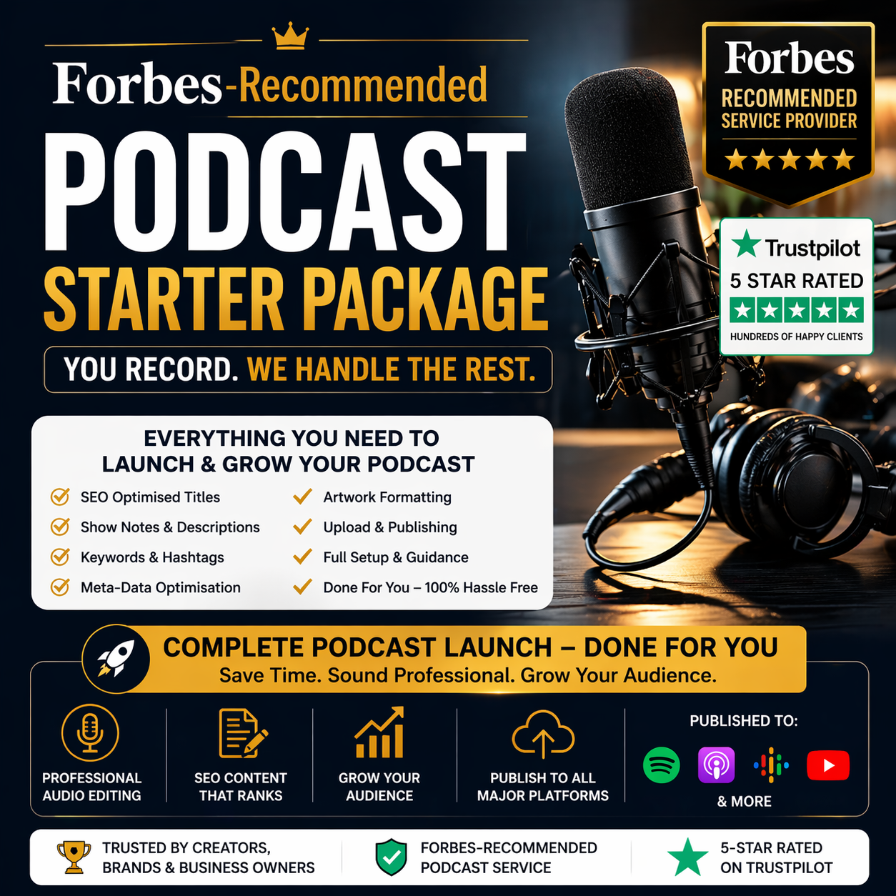 • Assistance setting up for publishing to Spotify, Apple Podcasts, etc
